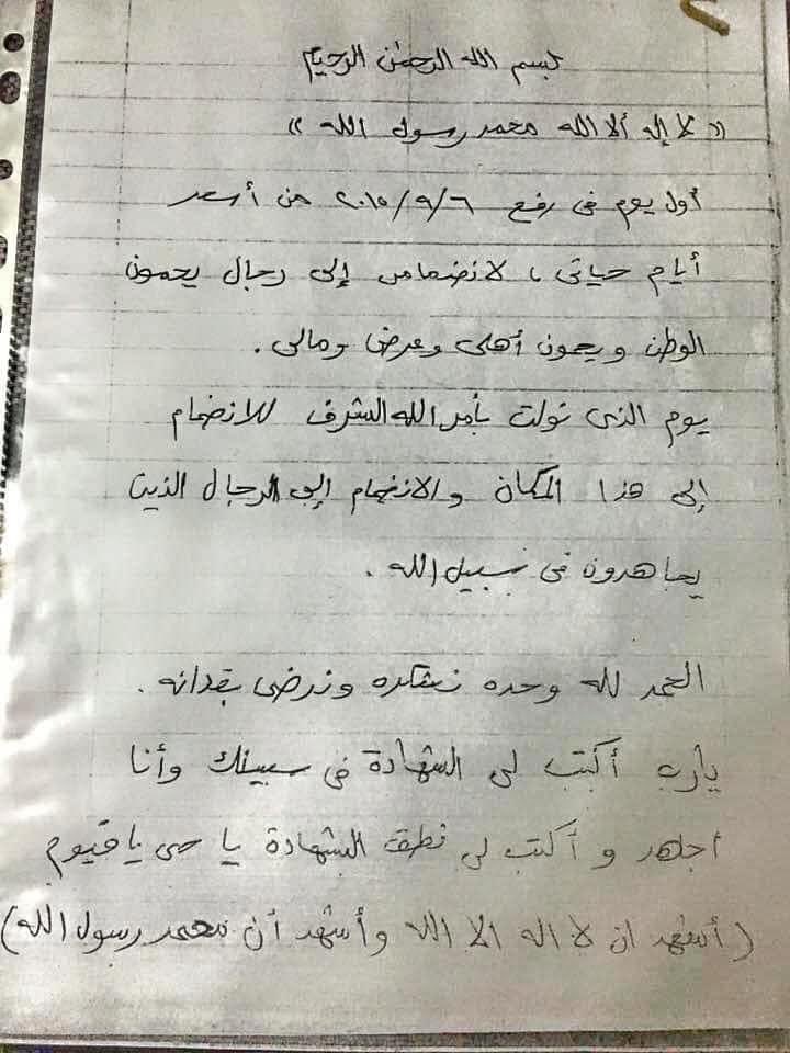 " إلى أبي الغالي وحبيبي وأحلى أب في الدنيا أنا آسف يا أبي العزيز علشان لم أقل لك أني في رفح أقاتل في سبيل الله، خوفا أن تقلق وخوفا على صحت حضرتك، والله أنا سعيد جدا وكل حاجة في هذا المكان مباركة وجميلة هي سيناء كده وحضرتك عارف.