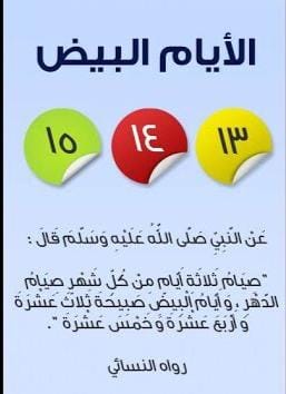 ايام البيض.. والأيام البيض توافق اليوم الثالث عشر، واليوم الرابع عشر، واليوم الخامس عشر من كل شهر من أشهر العام الهجري.