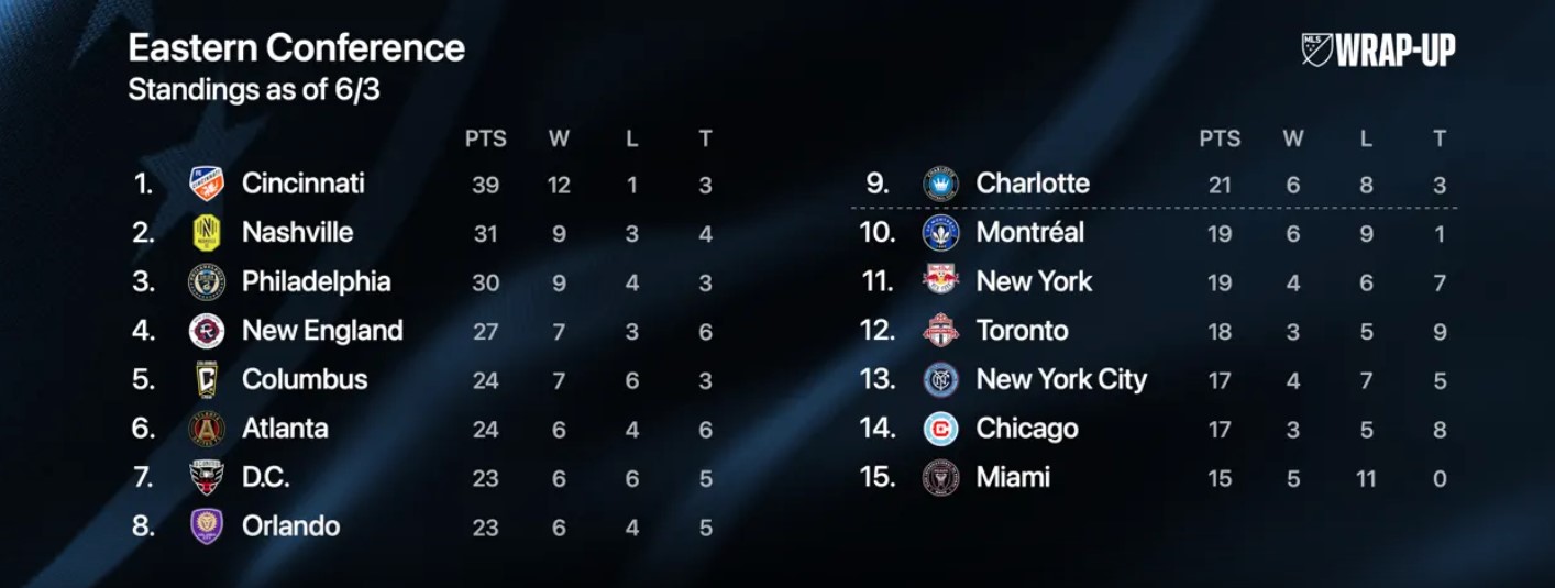 ويتواجد فريق إنتر ميامي في المركز الخامس عشر بجدول ترتيب الدوري الأمريكي، برصيد 15 نقطة من 16 مباراة.