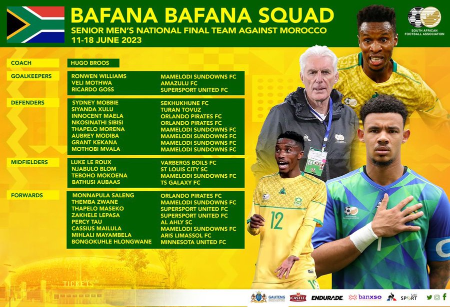 أعلن هوجو بروس المدير الفني لمنتخب جنوب إفريقيا، قائمة "الأولاد" استعدادًا لمواجهة منتخب المغرب، في التصفيات المؤهلة لبطولة كأس الأمم الإفريقية "كوت ديفوار 2023".