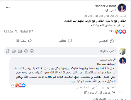 وقالت في منشور لها عبر "فيس بوك": "الحمد لله الله اكبر الله اكبر الله اكبر .. حقك رجع يا نيره حقك رجع يارب اللهم لك الحمد.. تم تنفيذ قصاص الله وعدله".