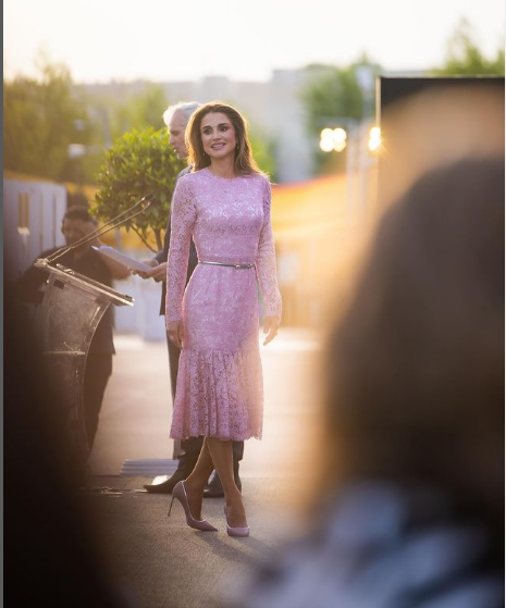 انتعلت الملكة رانيا حذاء أنيق ذو كعب عالي باللون الروز، تزينت ببعض المجوهرات الراقية والأنيقة التي منحتها إطلالة متكاملة، وقد نالت صورها إعجاب متابعيها على إنستجرام.