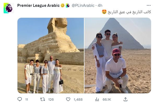ونشر الحساب الرسمي للبريميرليج على موقع التواصل الاجتماعي "تويتر" صورا لجوارديولا مع عائلته أثناء زيارتهم للآثار المصرية، وكتب: "كاتب التاريخ في عبق التاريخ".