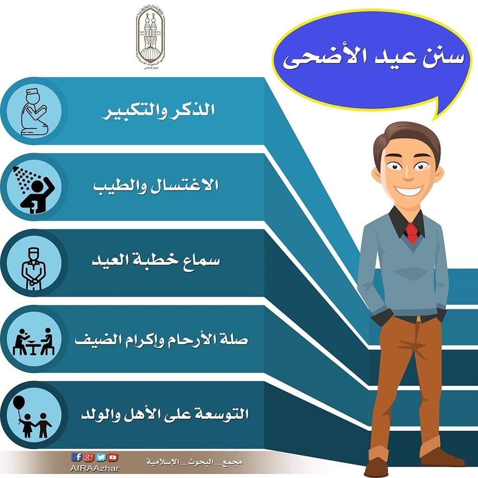 من جانبه أوضح مجمع البحوث الإسلامية في منشور له على صفحته الرسمية بموقع فيس بوك، سنن عيد الأضحى ونقدمها لأفراد الأمة الإسلامية كالتالي: