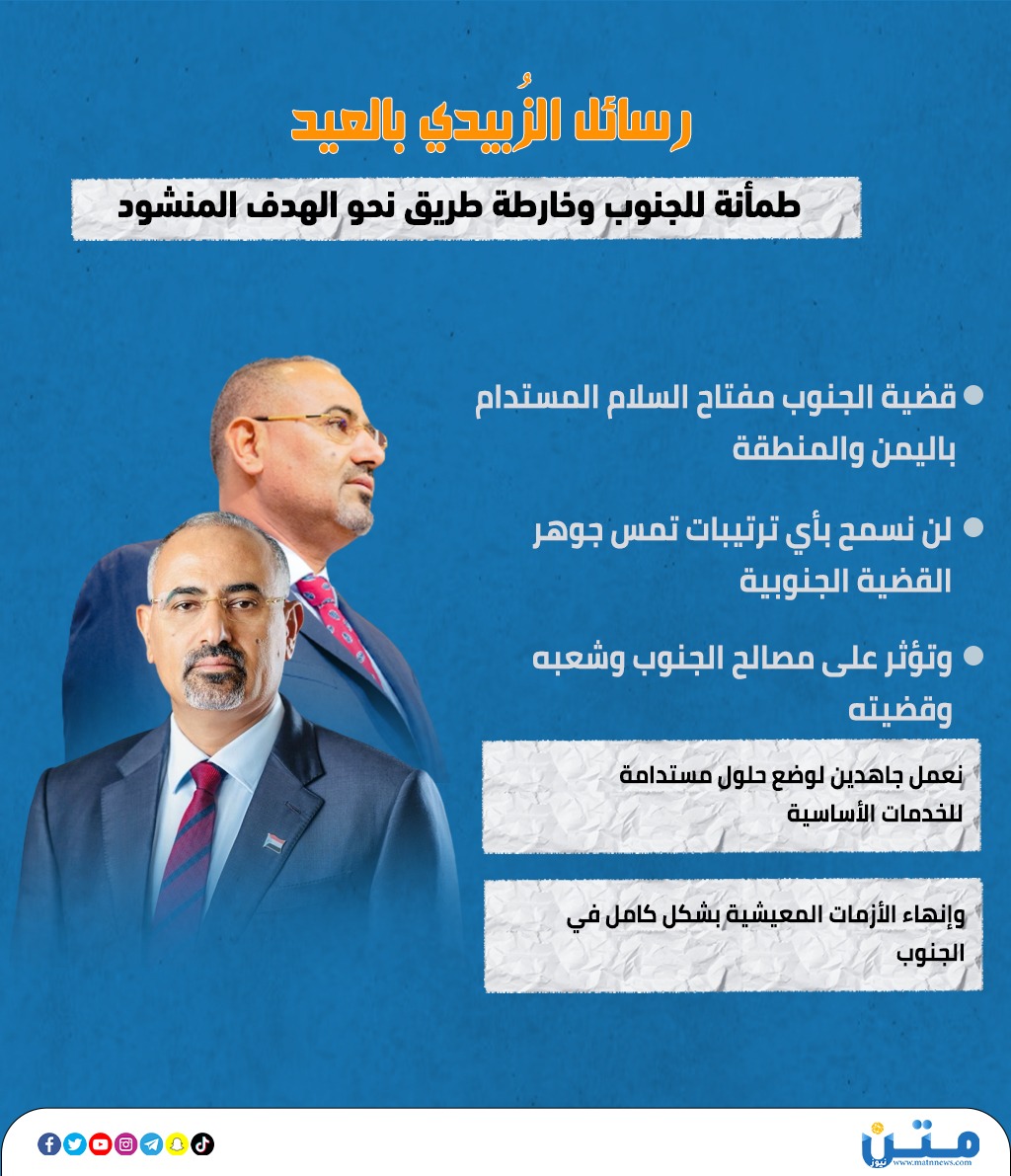 رسائل الزُبيدي بالعيد.. طمأنة للجنوب وخارطة طريق نحو الهدف المنشود (انفوجراف)