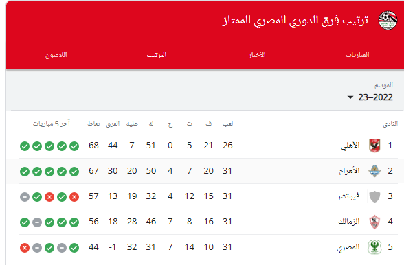 وترتيب الدوري المصري 2022_ 2023 كالاتي