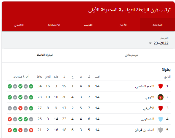 ترتيب الدوري التونسي 2023