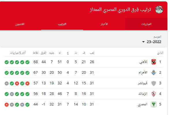 بعد مبارة فريق إنبى وفاركو.. جدول الدوري المصري بالنقاط