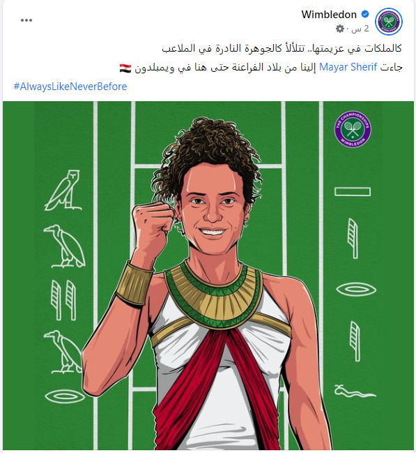 وتغزل موقع البطولة في اللاعبة المصرية، ونشر صورة مرسومة لها وهي ترتدي الملابس الفرعونية وعلق عليها: "كالملكات في عزيمتها.. تتلألأ كالجوهرة النادرة في الملاعب.. جاءت Mayar Sherif إلينا من بلاد الفراعنة حتى هنا في ويمبلدون".