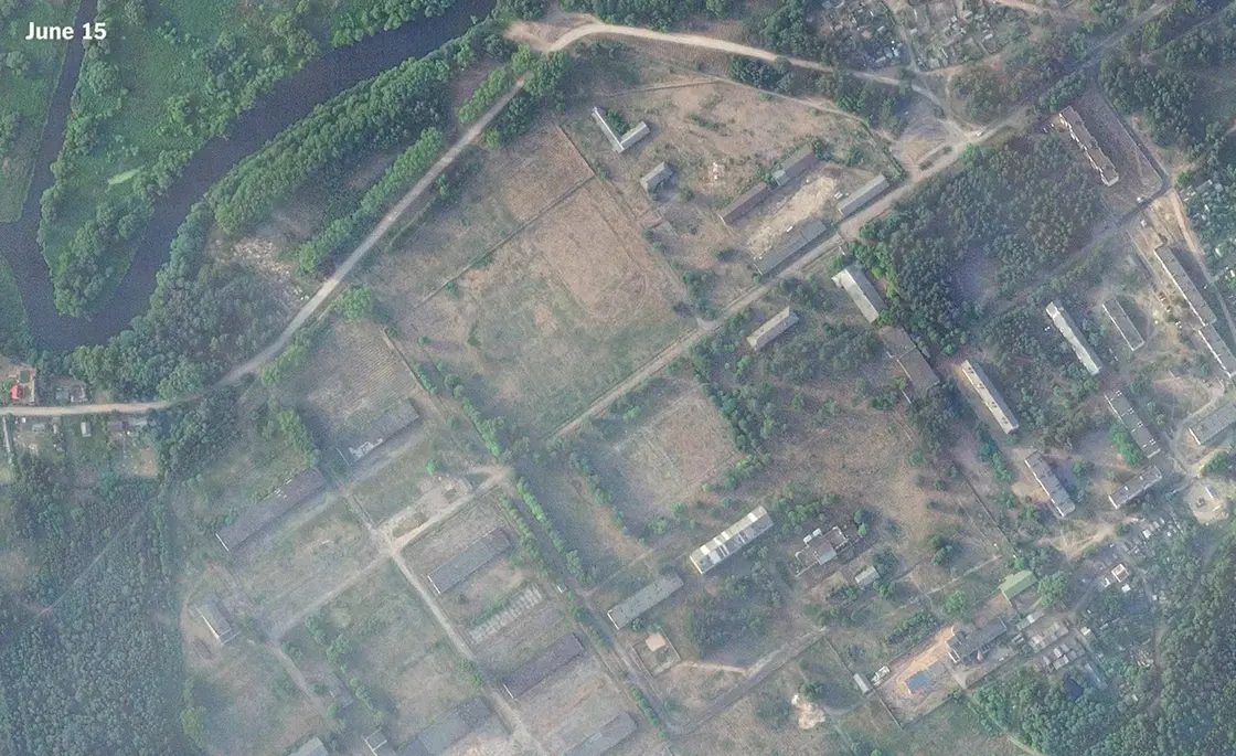 ويبدو أن بناء المعسكر الميداني، الذي يبعد حوالي 80 ميلًا جنوب شرقي العاصمة البيلاروسية مينسك، قد اكتمل في الغالب في الموقع.