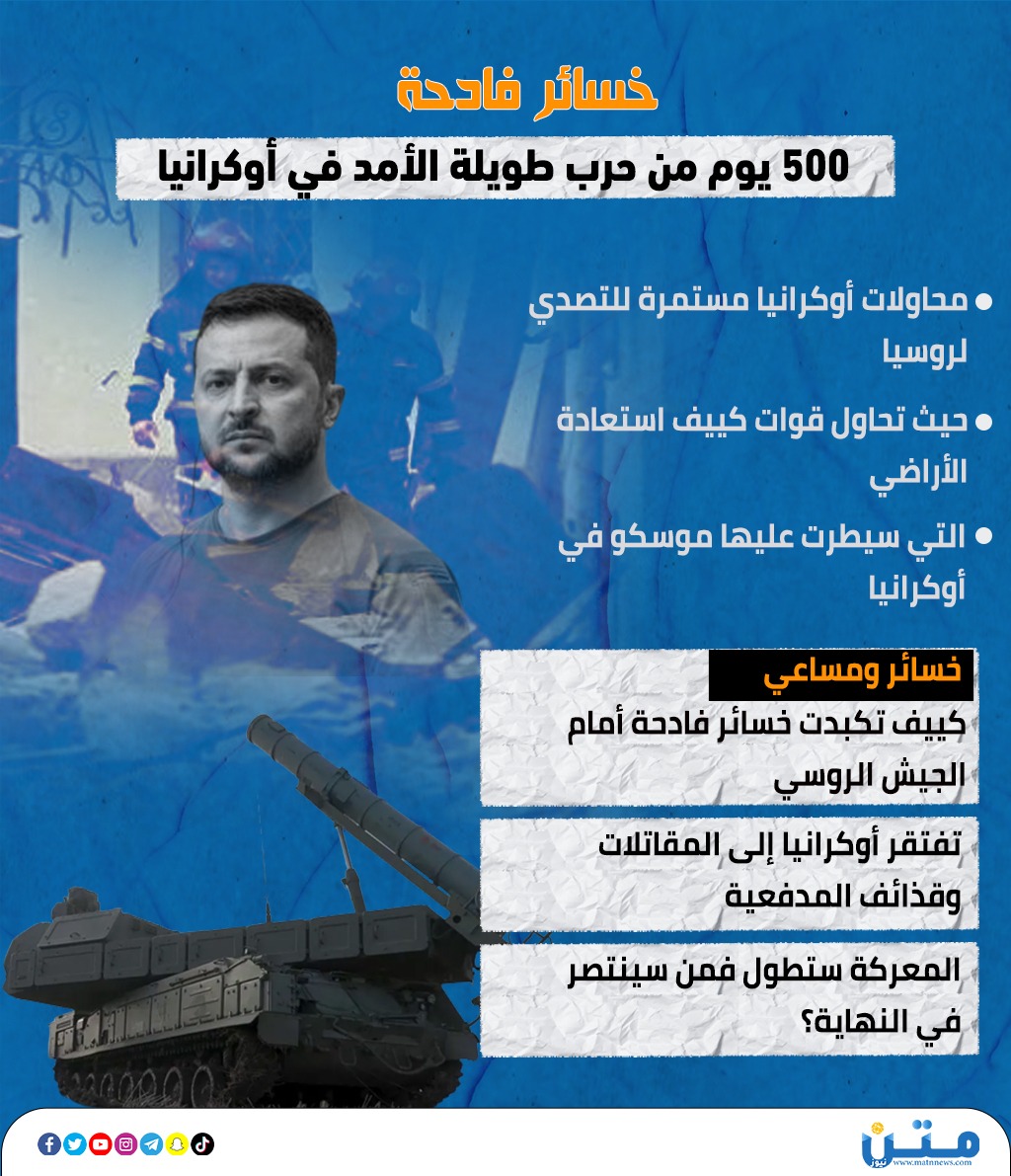 خسائر فادحة.. 500 يوم من حرب طويلة الأمد في أوكرانيا (انفوجراف)