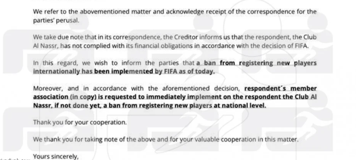 وأضافت الصحيفة السعودية، أن قرار الاتحاد الدولي جاء لعدم تنفيذ نادي النصر لقرار غرفة فض المنازعات الدولية، بشأن مستحقات نادي ليستر سيتي الإنجليزي، في صفقة شراء عقد المهاجم النيجيري أحمد موسى.