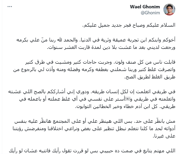 وأثارت تغريدة للنشاط المصري وائل غنيم على حسابه الرسمي بتويتر، وقال: السلام عليكم وصباح فجر جديد جميل عليكم، أخوكم وابنكم ابن تجربة عميقة وثرية في الدنيا. والحمد لله ربنا منّ علي بكرمه ورجعت لديني بعد ما عشت بلا دين لمدة قاربت العشر سنوات".