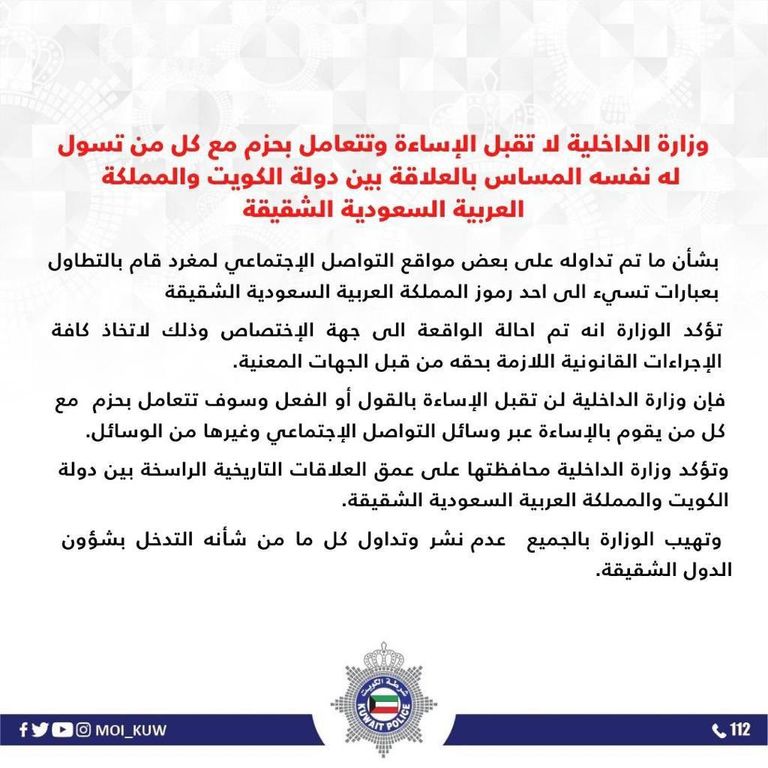 وأكدت وزارة الداخلية الكويتية، في بيان أصدرته مساء السبت، اتخاذ كافة الإجراءات القانونية ضد مغرد "قام بالتطاول بعبارات تسيء إلى أحد رموز السعودية"، وأكدت أنها "تتعامل بحزم مع كل من تسول له نفسه المساس بالعلاقة بين دولة الكويت والمملكة العربية السعودية".