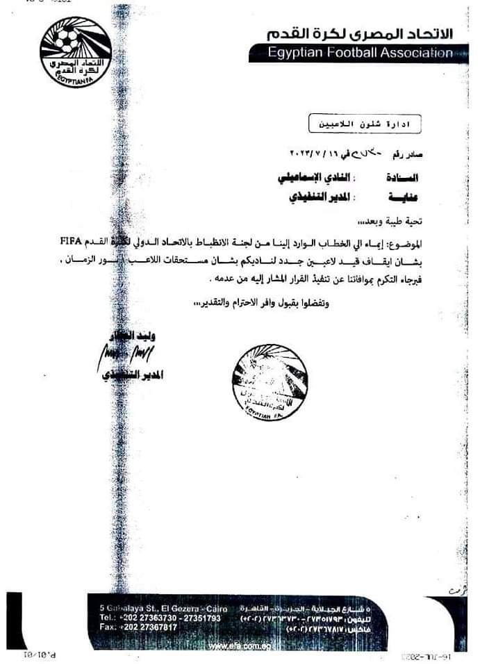 وقال اتحاد الكرة في خطابه إلى الإسماعيلي، إن لجنة الانضباط بالاتحاد الدولي لكرة القدم "فيفا"، أرسل خطابًا بشأن إيقاف قيد لاعبين جدد للنادي، بسبب اللاعب التونسي نور الزمان الزموري.