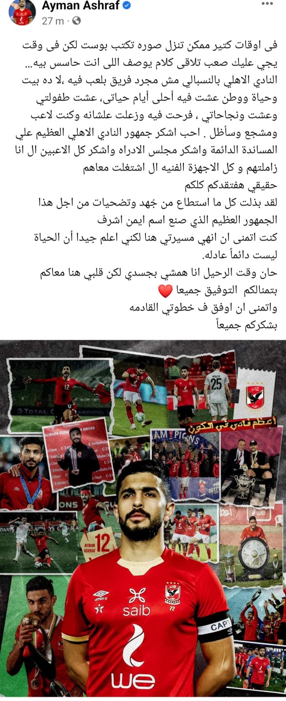 ووجه أيمن أشرف لاعب النادي الأهلي السابق، والمنتقل حديثًا لصفوف البنك الأهلي، رسالة وداع لجماهير القلعة الحمراء.