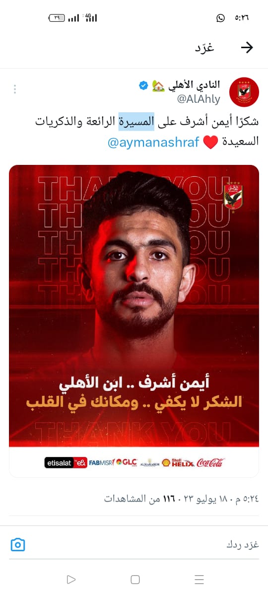 ونشر الحساب الرسمي للنادي الأهلي، على موقع التواصل الاجتماعي "فيس بوك"، صورة أيمن أشرف، وعلق عليها: "شكرا أيمن أشرف على المسيرة الرائعة والذكريات السعيدة".