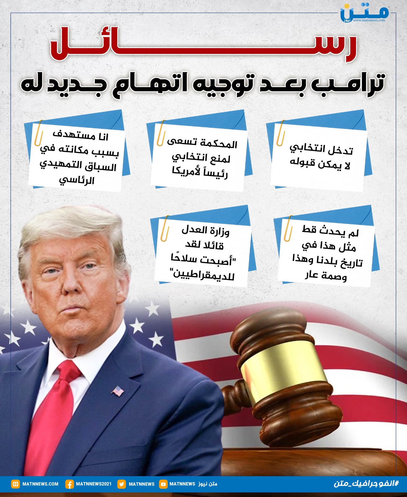رسائل ترامب بعد توجيه اتهام جديد له (إنفوجراف)