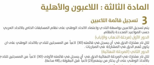 وشهدت اللائحة تعديل في موعد قيد اللاعبين بالبطولة العربية والتي جاءت كالتالي: