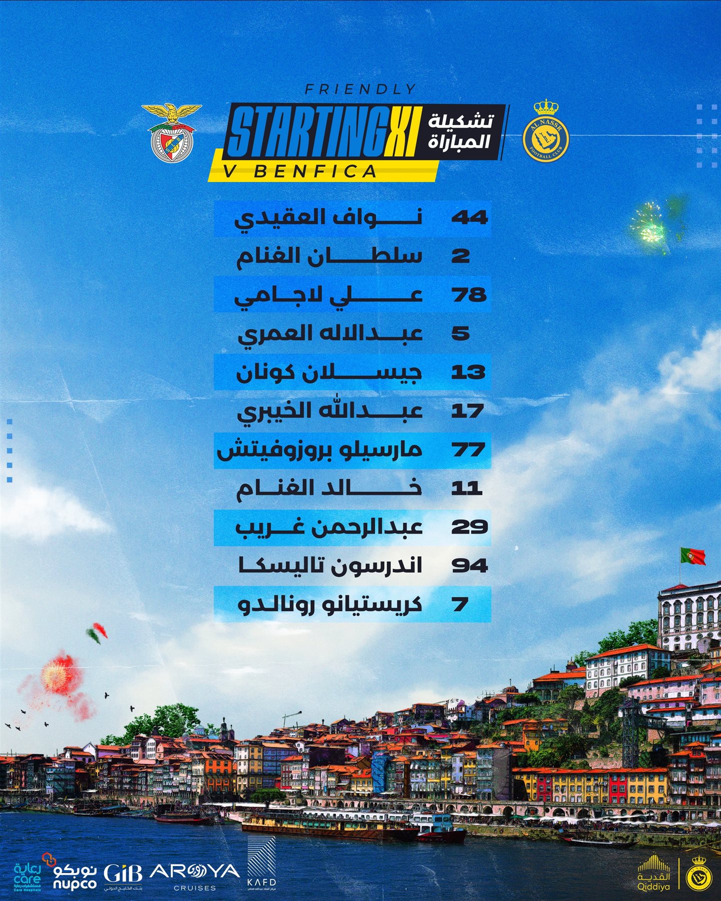 ويقود النجم البرتغالي كريستيانو رونالدو تشكيل النصر لمواجهة فريق بنفيكا البرتغالي وديًا.