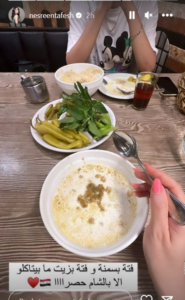 كما نشرت صورة لإحدى الوجبات التي تتناولها، وعلقت: "فتة بسمنة وفتة بزيت ما يؤكلان إلا بالشام".