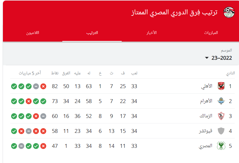 جدول ترتيب الدوري المصري الممتاز موسم 2022-2023