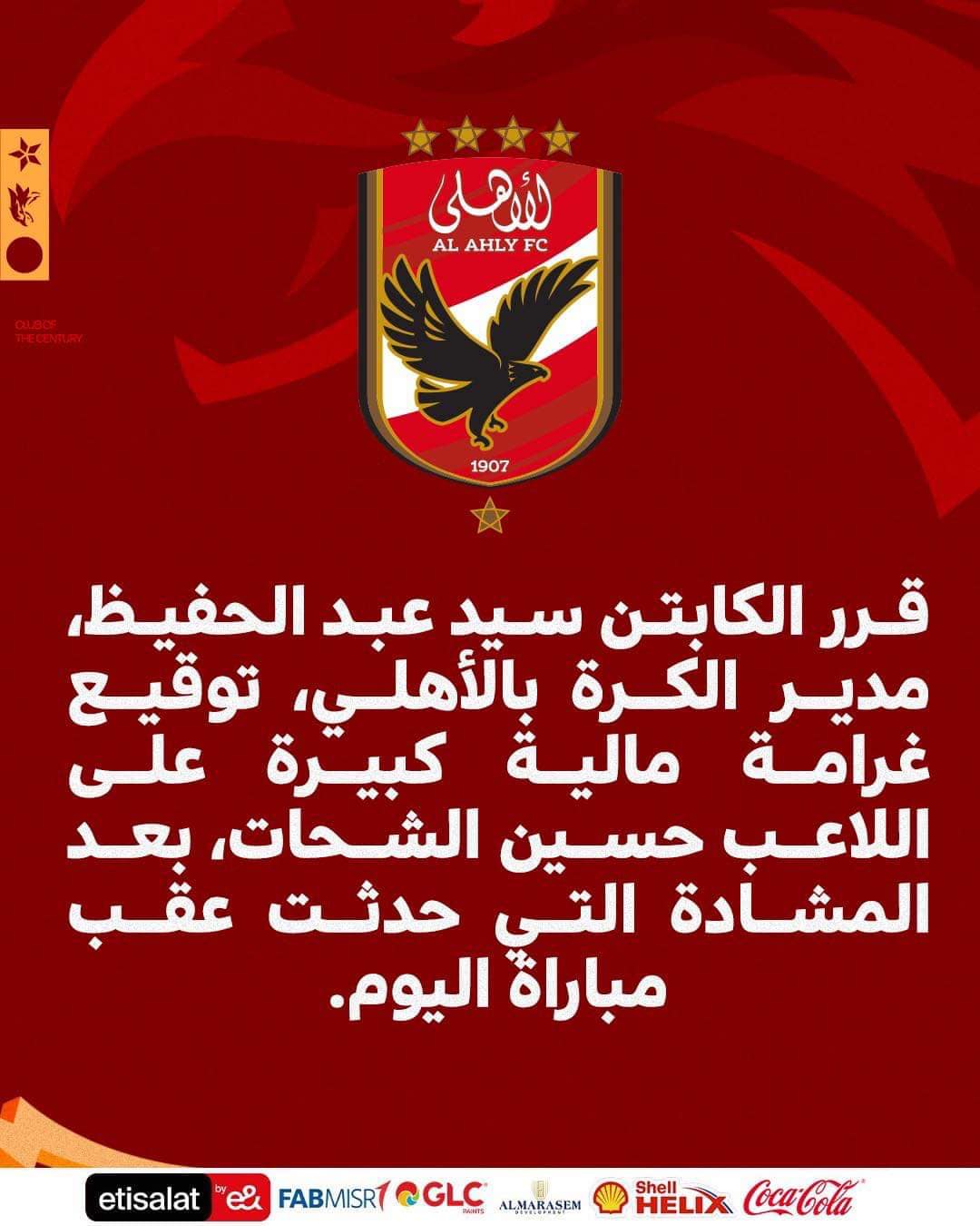وأعلن بعدها سيد عبد الحفيظ مدير الكرة بالنادي الأهلي، توقيع عقوبة مالية كبيرة على حسين الشحات بسبب تجازوه في حق الشيبي.
