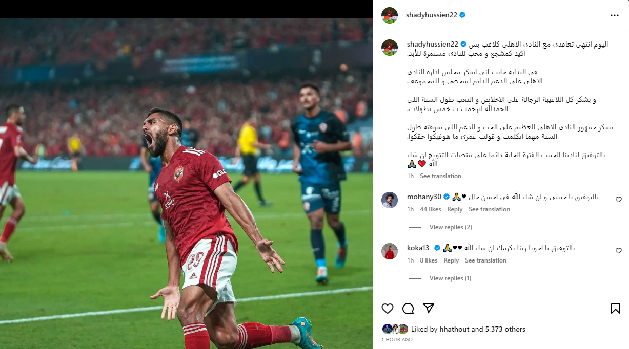 ونشر شادي حسين، صورة بقميص النادي الأهلي، عبر حسابه الرسمي على موقع التواصل الاجتماعي "إنستجرام": "اليوم انتهى تعاقدي مع النادي الأهلي كلاعب بس أكيد كمشجع ومحب للنادي مستمرة للأبد".