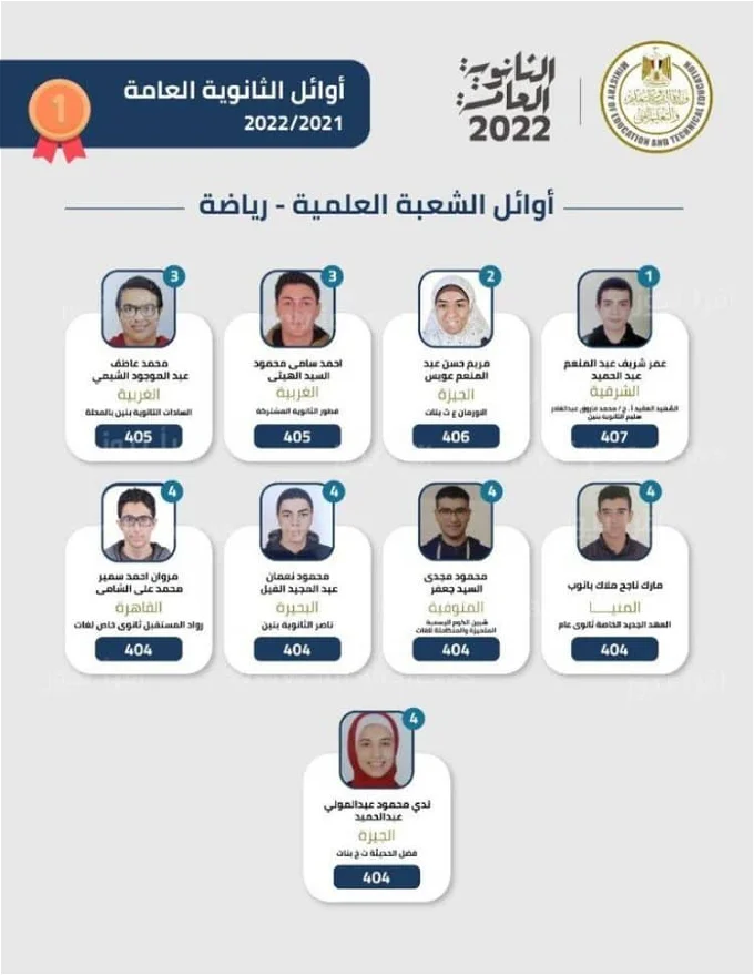 وأعلنت وزارة التربية والتعليم أسماء أوائل الثانوية العامة 2023 علمي علوم، وجاء الترتيب كالتالى: