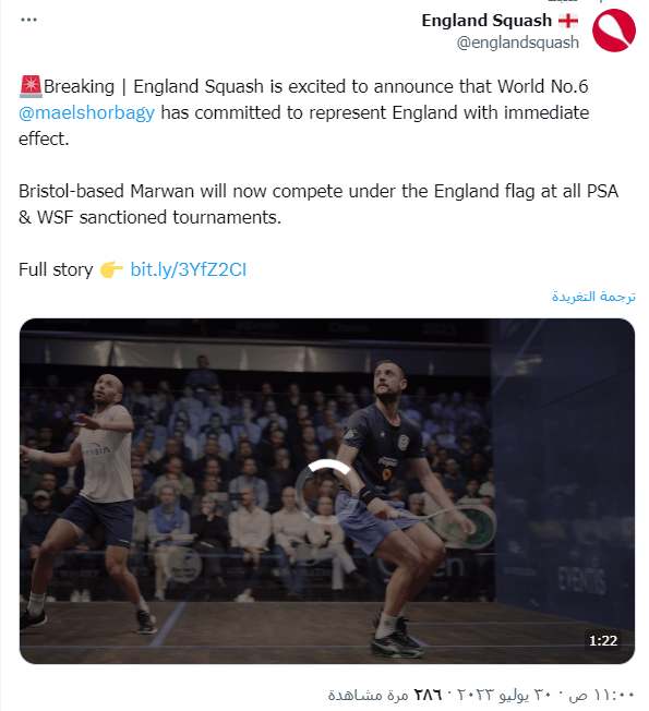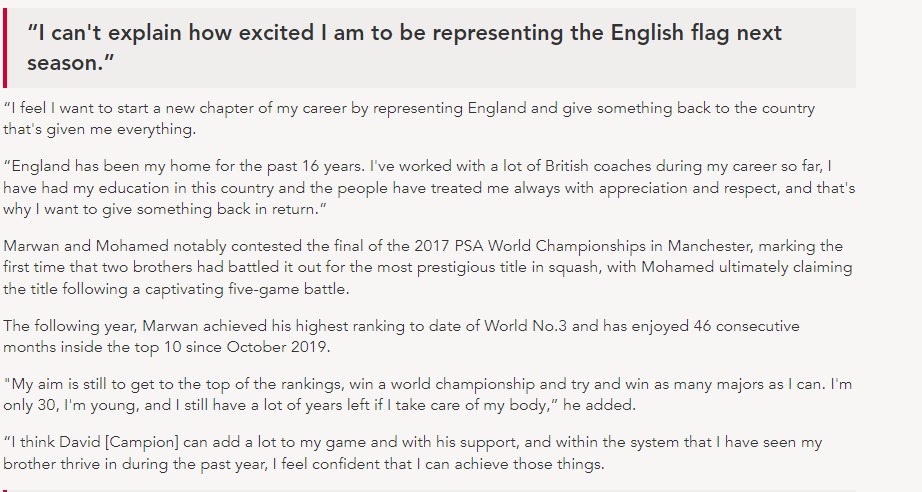 وكتب الاتحاد الإنجليزي، "يسر إنجلترا للاسكواش أن يعلن أن مروان الشوربجي المصنف رقم 6 على العالم قد التزم بتمثيل إنجلترا على الفور".