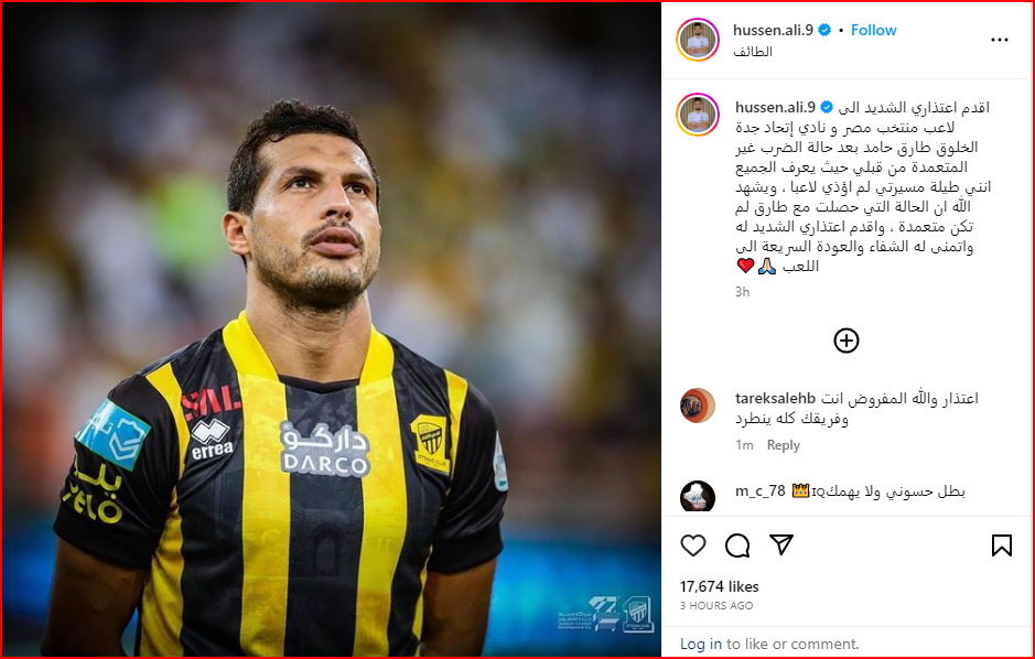 وقال حسين علي في بيان رسمي نشره عبر حسابه الرسمي على موقع "إنستجرام": "أقدم اعتذراي الشديد إلى لاعب منتخب مصر ونادي اتحاد جدة الخلوق طارق حامد بعد حالة الضرب غير المتعمدة من قبلي، حيث يعرف الجميع أنني طيلة مسيرتي ما آذيت لاعبًا، يشهد الله أن الحالة التي حصلت مع طارق لم تكن متعمدة وأقدم اعتذاري الشديد له وأتمنى له الشفاء والعودة السريعة إلى الملاعب".