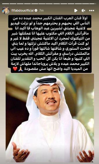 وكتبت فيفي عبر خاصية القصص القصيرة بموقع انستجرام "أولًا فنان العرب الفنان الكبير محمد عبده، ده من الناس اللي بحبهم وبحترمهم جدًا ولو نزلت فيديو لأغنية لشيرين عبدالوهاب فأكيد أنا ما قرأتش الكلام اللي مكتوب عليه، أنا عملت لها شير من التيك توك لمجرد أن الأغنية عجبتني فقط لا غير".