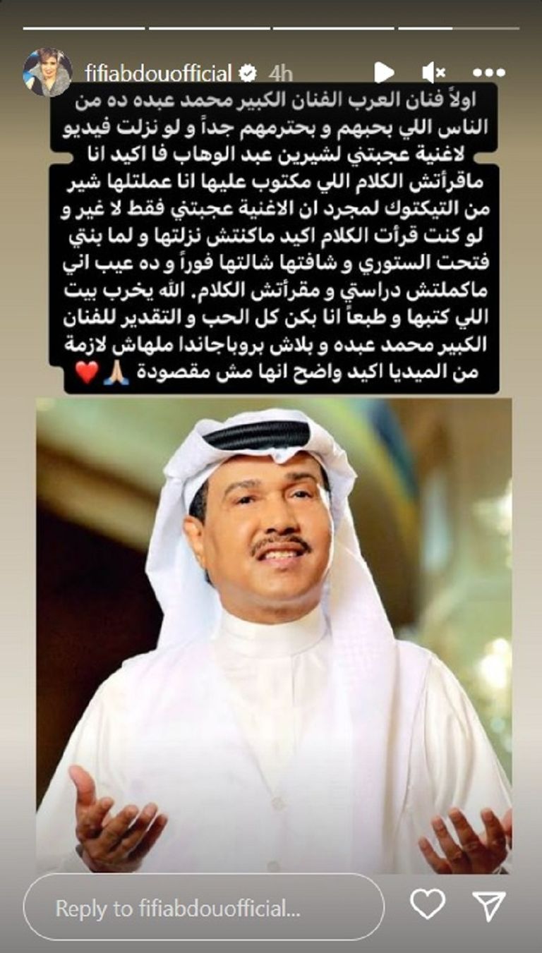 لاحقًا، أصدرت "فيفي" توضيحًا بشأن ما شاركته عبر حسابها، فنشرت عبر خاصية "ستوري" صورة لمحمد عبده، وعلقت بقولها: "أولًا فنان العرب الفنان الكبير محمد عبده من الناس الذين أحبهم وأحترمهم جدًا، ولو شاركت مقطع فيديو لأغنية أعجبتني لشيرين عبدالوهاب فبالتأكيد لم أقرأ الكلمات المدوّنة عليها".