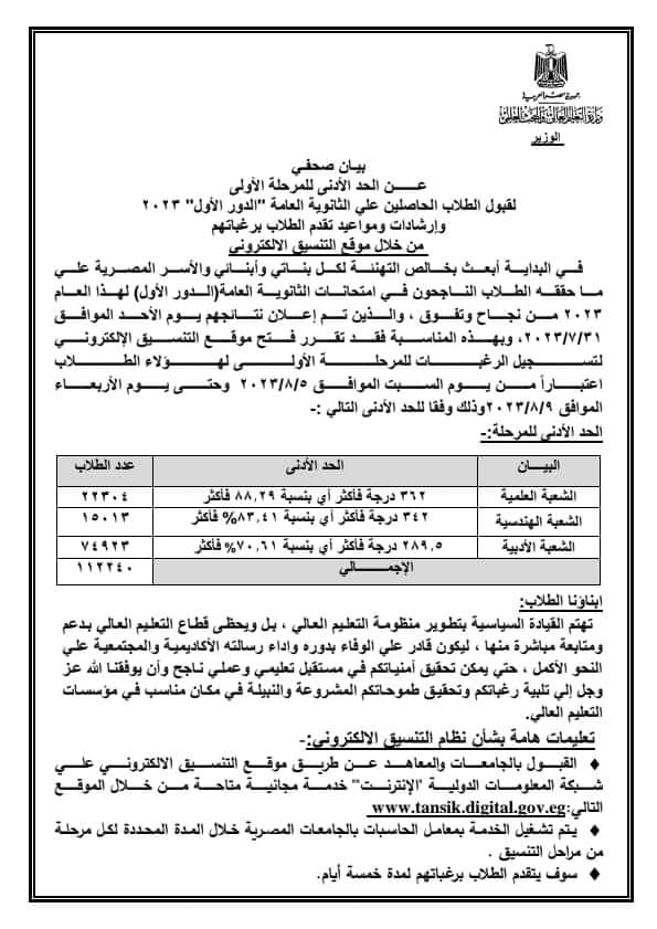 فقد تقرر فتح موقع التنسيق الإلكتروني لتسجيل الرغبات للمرحلة الأولى لهؤلاء الطلاب اعتبارًا من يوم السبت الموافق 5/8/2023 وحتى يوم الأربعاء الموافق 9/8/2023وذلك وفقا للحد الأدنى التالي..