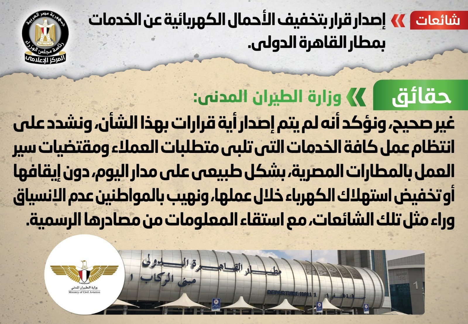 وقال بيان صادر عن مجلس الوزراء اليوم: "انتشر في بعض المواقع الإلكترونية وصفحات التواصل الاجتماعي أنباء بشأن إصدار قرار بتخفيف الأحمال الكهربائية عن الخدمات بمطار القاهرة الدولي، وقد قام المركز الإعلامي لمجلس الوزراء بالتواصل مع وزارة الطيران المدني، والتي نفت تلك الأنباء، مُؤكدةً أنه لا صحة لتخفيف الأحمال الكهربائية عن أي من الخدمات بمطار القاهرة الدولي".