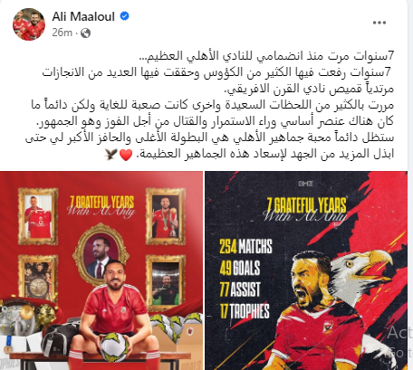 وكتب معلول عبر حسابه الرسمي على موقع التواصل الاجتماعي "فيسبوك": "7 سنوات مرت منذ انضمامي للنادي الأهلي العظيم".