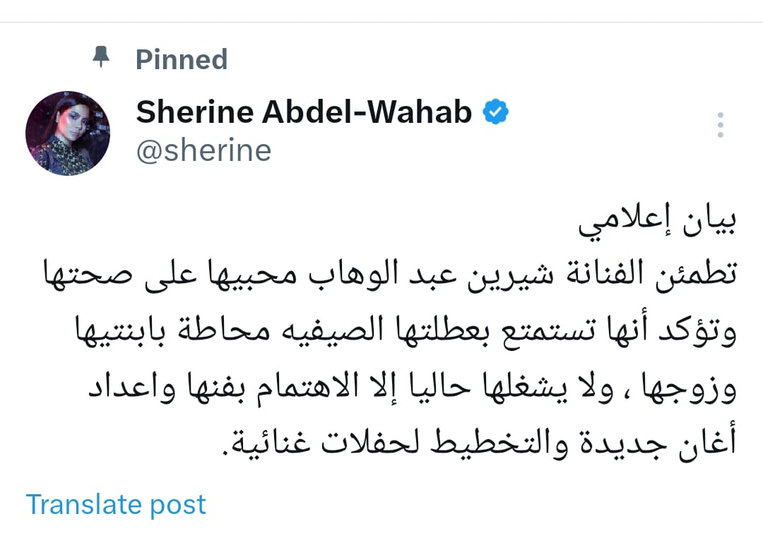 وقالت شيرين فى البيان: تطمئن الفنانة شيرين عبد الوهاب محبيها على صحتها وتؤكد أنها تستمتع بعطلتها الصيفية محاطة بابنتيها وزوجها ولا يشغلها حاليا إلا الاهتمام بفنها وإعداد أغان جديدة والتخطيط لحفلات غنائية.