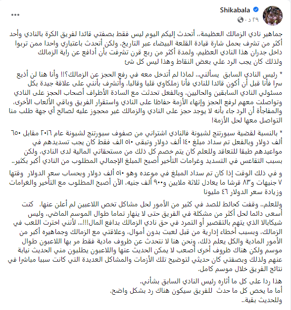 واختتم شيكابالا رسالته بـ: "هذا ردا على كل ما أثاره رئيس النادي السابق بشأني، أما ما يخص كل ما حدث للفريق سيكون هناك رد بشكل واضح. وللحديث بقية".