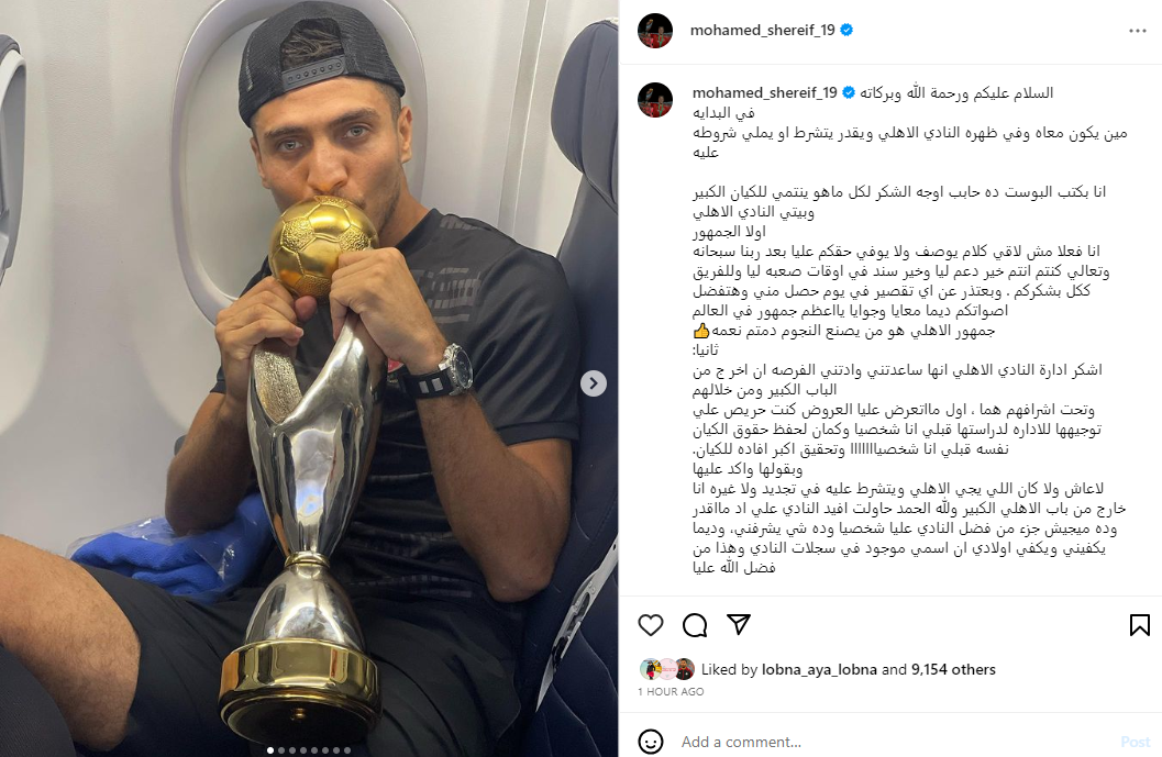 وكتب شريف، عبر حسابه الشخصي على موقع التواصل "إنستجرام": "السلام عليكم ورحمة الله وبركاته.. في البداية.. مين يكون معاه وفي ظهره النادي الأهلي ويقدر يتشرط أو يملي شروطه عليه.. أنا بكتب البوست ده حابب أوجه الشكر لكل ما هو ينتمي للكيان الكبير وبيتي النادي الأهلي".