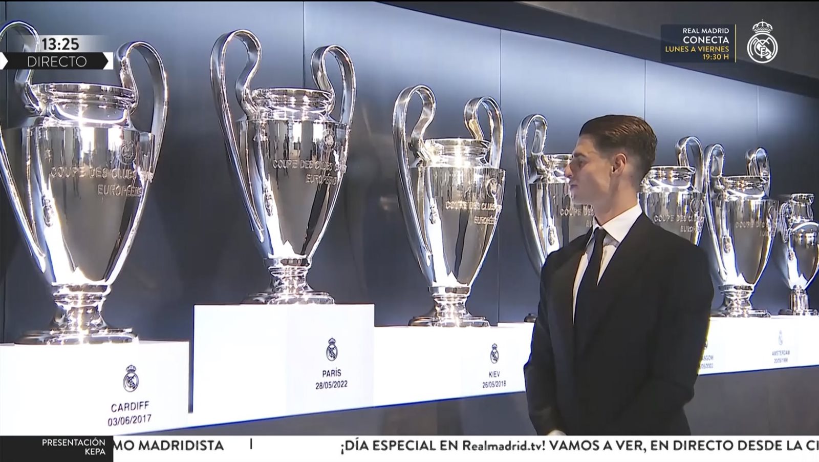 منح فلورنتينو بيريز رئيس نادي ريال مدريد، الحارس الجديد كيبا قميصه مع الملكي رقم 25، والتقط الصورة التذكارية معه أمام كؤوس المرينجي الـ 14 الأوروبية.