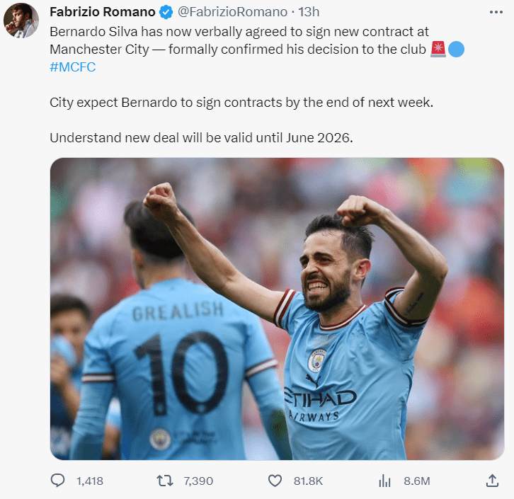 قرر النجم البرتغالي برناردو سيلفا وضع حد للجدل حول مستقبله مع فريق مانشستر سيتي، وفقًا للمعلومات الواردة من الصحفي الموثوق فابريزيو رومانو، تم التأكيد على أن سيلفا قد وافق بالفعل على تجديد عقده مع النادي الإنجليزي، وهذا يمتد حتى عام 2026.