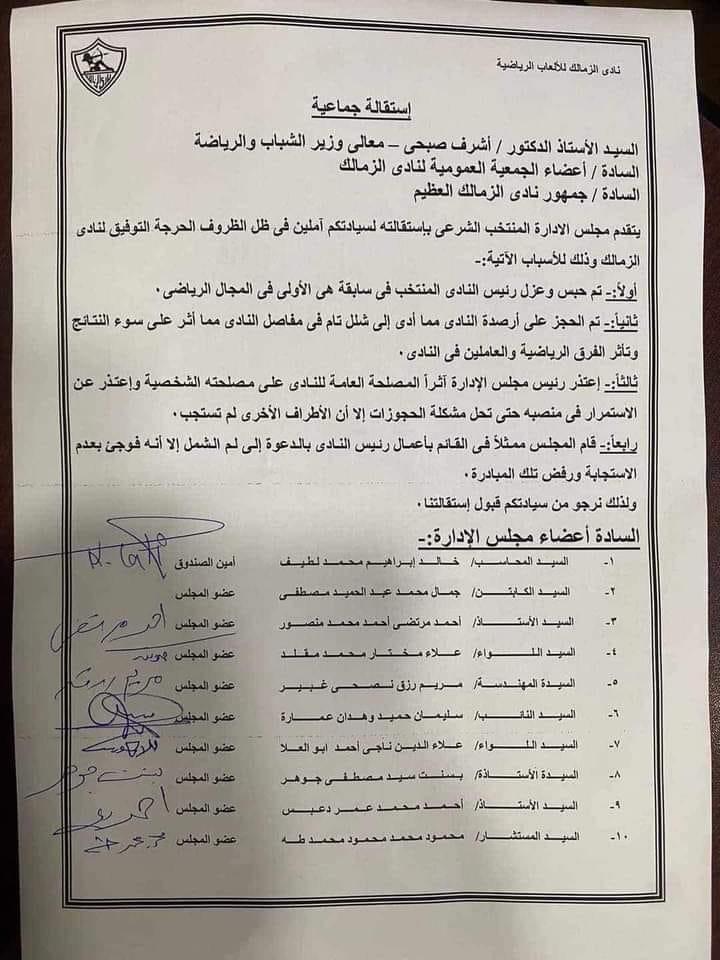 وشهد خطاب الاستقالة الموجه لوزير الرياضة، توقيع جميع أعضاء مجلس إدارة الزمالك، فيما عدا جمال عبد الحميد، دون الكشف الأسباب.