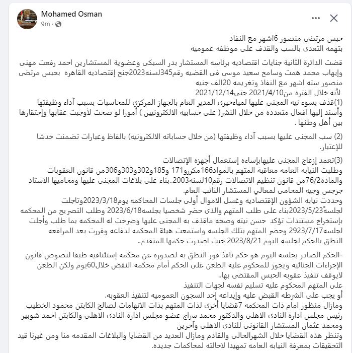 وكتب محمد عثمان عبر حسابه الرسمي على موقع التواصل الاجتماعي "فيسبوك": "الحكم الصادر بجلسة اليوم هو حكم نافذ فور النطق به، لصدوره عن محكمه استئنافية طبقًا لنصوص قانون الإجراءات الجنائية، ويجوز للمحكوم عليه الطعن على الحكم أمام محكمه النقض خلال 60 يوم".