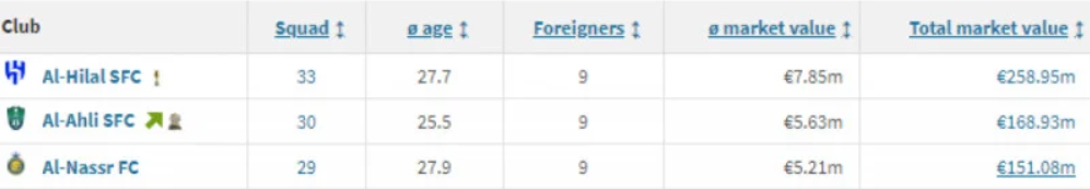 يتصدر نادي الهلال ترتيب الأندية من حيث القيمة السوقية بـ "258.95 مليون يورو"، وذلك بعد الصفقات القوية التي ضمها مؤخرًا والتي يعد أبرزها النجم البرازيلي نيمار دا سيلفا، القادم من باريس سان جيرمان الفرنسي.