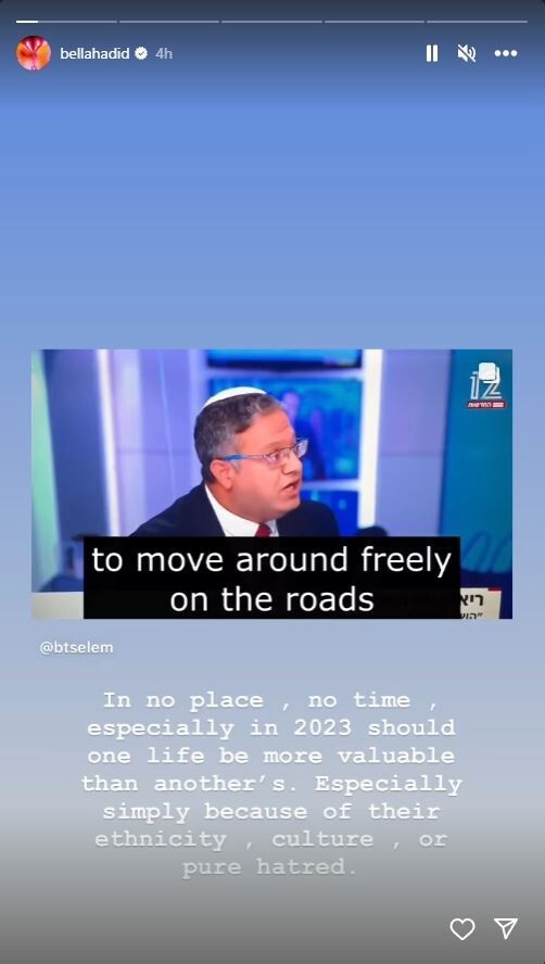 وقامت عارضة الأزياء المعروفة بنشاطها ضد إسرائيل بنشر "ستوري" على صفحتها في "إنستغرام" التي يتابعها ما يقارب الـ60 مليون شخص، عرضت خلاله تصريحات بن غفير، وقالت: "لا يوجد مكان في أي وقت وخاصة في عام 2023، تكون فيه حياة شخص أكثر أهمية من حياة شخص آخر.. لا سيما بسبب أصله أو ثقافته أو كراهيته الخالصة".
