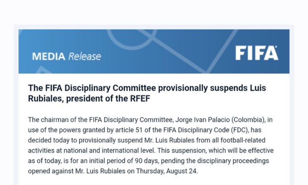 وأوقف الاتحاد الدولي، لويس روبياليس، عن ممارسة مهامه في الاتحاد الاسباني محليًا ودوليًا، لمدة 90 يوما تبدأ من اليوم.