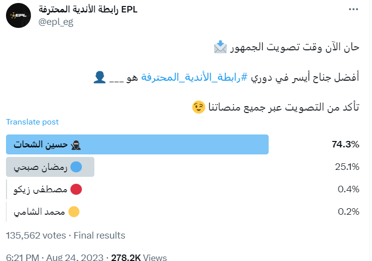 وتمكن جناح الأهلي من حسم الاستفتاء بتصويت الجماهير، بعدما حصل على 74.3% من الأصوات، مقابل 25.1% لرمضان صبحي، فيما حصد كل من الشامي وزيكو نسب ضئيلة من تصويت الجماهير.