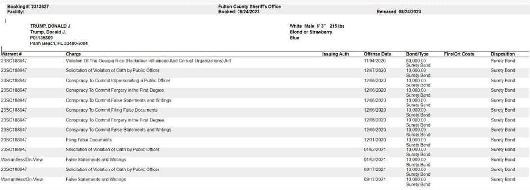 كما تم تدوين تفاصيل أخرى عن ترامب، مثل رقمه التعريفي "السجين رقم Po1135809"، ولون عيونه "أزرق" والشعر "أشقر".