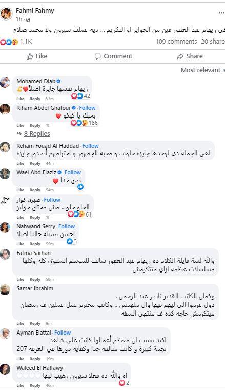 ونشر "كريم" بوست عبر صفحته الرسمية على "فيس بوك" وعلق قائلًا: "هي ريهام عبد الغفور فين من الجوايز والتكريمات، دي عملت سيزون ولا محمد صلاح"، ولاقى البوست تفاعل من متابعيه منهم الفنان دياب وعلق قائلًا: "ريهام نفسها جايزة أصلًا"، والفنان صبري فواز قائلًا: "الحلو حلو مش محتاج جوايز".