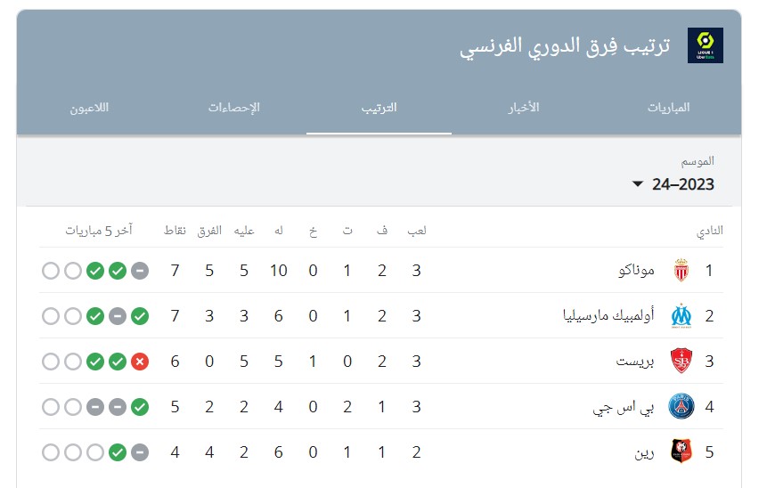 كما يتصدر نادي موناكو جدول ترتيب الدوري الفرنسي برصيد7 نقاط، بينما يأتي نادي باريس سان جيرمان الفرنسي في المركز الرابع برصيد 5 نقاط في جدول ترتيب الدوري الفرنسي 2023/2024.